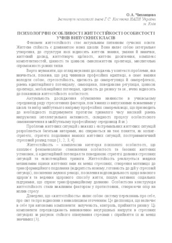 - Чиханцова, О.А. (2017) Psychological features of personality hardiness of school-leavers In: Інноваційні технології розвитку ресурсів особистості . Вишемирський В.С., м. Херсон, Україна, pp. 70-73.