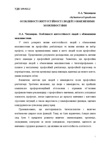 - Чиханцова, О.А. (2016) Peculiarities of hardiness of people with disabilities Проблеми сучасної психології, 32. pp. 523-533. ISSN 2227-6246