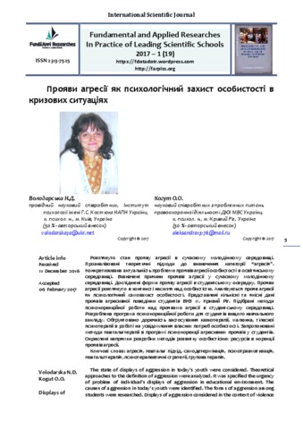- Володарська, Наталія Дмитрівна and Когут, Олександра Олександрівна (2017) Displays of aggression as psychological protection of the individual in crisis situations Fundamental and applied researches in practice of leading scientific schools, 1 (19). pp. 9-20. ISSN 2313-7525