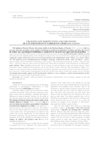 - Володарська, Наталія Дмитрівна and Чорнописка, Оксана Петрівна (2017) Changing Life Perspectives and Strategies of Ato Participants’ Families in Crisis Situations Science and Education, 3. pp. 51-57. ISSN 2311-8466