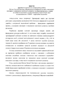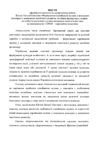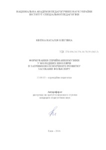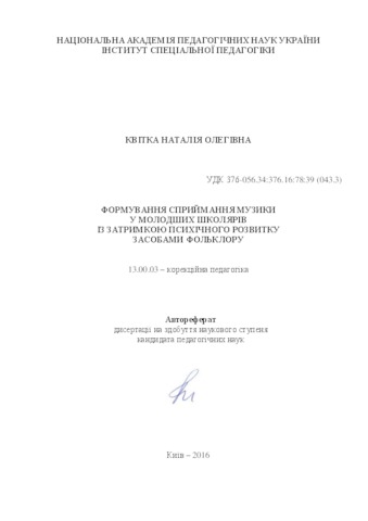 This dissertation thesis presents the results of foreign and domestic psychological and educational researches analysis of problem music perception of students with development delay at primary school. This analysis showed that the formation of music perception is the basis of the formation of the musical culture of the individual. It is very important to younger students with special educational needs, because music is deeply democratic art and performs developmental, educational functions of emotional and cognitive sphere of pupils. Folklore is the means of spiritual influence and national-patriotic education of children. This face is especially important for problems solving in the practice of educational institutions for children with development delay. In this dissertation thesis the features of music perception of students with development delay at primary school were revealed. In particular the quality of knowledge and understanding music image of a folk song of students were defined. It is difficult to understand, arrange and generalise the knowledge about folk music for students. They have significant difficulties regarding the understanding music image of the Ukrainian folk song. The students showed a shallow and unstable interest and a low emotional response. The adequacy of assessment depended on their experience and motivation. Students showed sufficient activity in the process of musical activities, but level of their autonomy and creativity was low. There were defined four levels of a formation of music perception of students at primary school with development delay on the material of folklore. It was founded that without purposeful musical-aesthetic education and pedagogical management of music activities students show the sufficient or the average level. Along this there were detected the positive age dynamic of development of music perception, but the manifestation of it was expressionless, because, in our opinion, it was ineffective pedagogical management of music activities of students. This experimental search allowed us to determine the pedagogical conditions providing efficiency of formation process of music perception of children with development delay: a step-by-step educational process; increasing the motivation of cognitive activity and conscious assimilation of knowledge and mastery of the performing skills in musical activities; special pedagogical management of cognitive activity of students of primary school with development delay; the improvement of knowledge of teachers, subject teachers and parents of children and their families about folklore. The essence of the developed methods is in the gradual formation of music perception of children with development delay, using the leading educational, correctional objectives of each stage of the meaningful features of the work, special methods of activation, ordering, organizing, direction, reinforcement of cognitive activity, challenge and consolidate them in adequate emotional and perceptual reactions, motivated, self-assessments, development of activity, independence and creativity. In particular, it is proved the possibility of mastering by children with development delay knowledge, abilities and skills of musical folklore in order to understand musical image and the ability to reproduce in practical musical activities. This paper presents the selection criteria of folk music for learning with students with development delay, namely: according to the age and psychological peculiarities of the perception of children; the musical value, expressed in emotional appeal and clear sound communication of musical expression; the educational value of folk music, which is reflected in the possibility of attainment of the pupils it meaningful and constructive side; presence the ability to compare folk music with other music or personal life experience of the student, establishing analogies and associations. This research of the proposed proprietary technology of formation of musıc perceptıon of students with development delay in the second, third and fourth grades of primary school proved its validity and remedial and developmental efficiency to influence on the development of children’s music image understanding of the Ukrainian folk song, adequate emotional-personal attitude and ability to reproduce in practical musical activities. Thus, in particular, after a three-year formative experiment an indication of the high level of development of music perception of different genres of folk music of the students in the experimental group significantly exceeded the corresponding result of the students of the control group. It means that there are qualitative changes of music perception of students with mental retardation at primary school, e.g.: enrichment of the emotional-perceptual experience; increasing knowledge and understanding of the folk songs; the increase of activity and independence of students in the process of perception and performance of folk music.