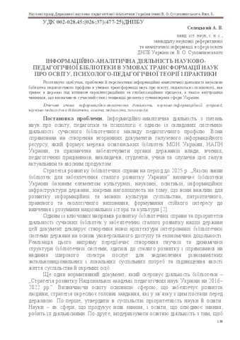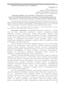 The article examines the achievements, problems and prospects of information-analytical activity of scientific library pedagogical profile in terms of transformation of science education, pedagogy and psychology, which continues in the state under the influence of European integration and globalization, as well as internal factors that determine the current state and development trends Ukraine humanitarian sphere.