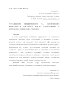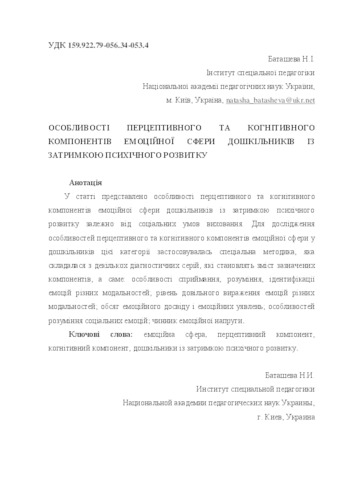 - Баташева, Наталія Іванівна (orcid.org/0000-0002-2685-2258) (2017) The features of perceptive and cognitive components of the emotional sphere preschool children with mental retardation Особлива дитина: навчання і виховання, 2 (82). pp. 48-55. ISSN 2312-2781