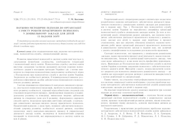 - Костенко, Т.М. (orcid.org/0000-0002-4976-1236) (2010) Scientific and methodological approaches to the organization and content of the work of a practical psychologist in a preschool institution for vision-impaired children Актуальні проблеми навчання та виховання людей з особливими потребами, 7 (9). pp. 410-417. ISSN ISBN 978-966-388-329-8