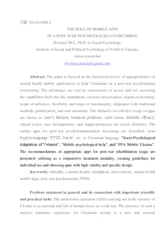 - Дворник, Марина Сергіївна (orcid.org/0000-0003-1505-0169) (2017) The role of mobile apps in a post-war psychotrauma overcoming Проблеми політичної психології, 5 (19). pp. 11-24. ISSN 2411-1449