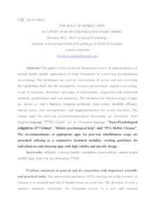 The paper is focused on the theoretical review of appropriateness of mental health mobile applications to help Ukrainians in a post-war psychotrauma overcoming. The advantages are seen in: convenience of access and use; accessing the capabilities built into the smartphone; resource preservation; stigma overcoming; scope of influence; flexibility and range of functionality; alignment with traditional methods; gamification; and user autonomy. The obstacles for effective usage of apps are shown as: user’s features; technical problems; costs issues; doubtful efficacy; ethical issues; user incompetence; and inappropriateness for severe disorders. The certain apps for post-war psychotraumatization decreasing are described: from English-language “PTSD Coach” etc. to Ukrainian-language “Socio-Psychological Adaptation of Veterans”, “Mobile psychological help”, and “PFA Mobile Ukraine”. The recommendations of appropriate apps for post-war rehabilitation usage are presented: utilizing as a conjunctive treatment modality, creating guidelines for individual use and choosing apps with high validity and specific design.