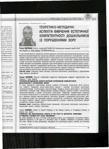- Костенко, Т.М. (orcid.org/0000-0002-4976-1236) (2014) Theoretical and methodical aspects of studying the aesthetic competence of preschool children with visual impairment Особлива дитина: навчання і виховання, 3 (71). pp. 77-81. ISSN 2312-2781