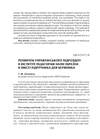 - Калініна, Г. М. (2016) Development of management subdivision in the Institute of Pedagogy of the NAES of Ukraine In the content of textbook for manager Проблеми сучасного підручника (17). pp. 150-162. ISSN 2411-1309