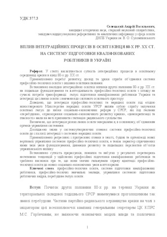 - Селецький, А.В. (2016) The impact of integration processes in education of the late 80's, xx century, on the system for skilled workers training in Ukraine Theory and methodology of vocational education, 10 (2).