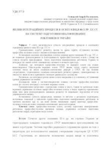 The article reveals the essence of integration processes in educational environment of the country in the late 80's of the XX century. The development, experience and attempts to combine vocational education systems with other educational units are analyzed. The author determines consequences of integration educational effects of the second half of the 80's, XX century, on further operation and functioning of vocational education in view of current needs of transformation of Ukraine’s skilled workers training industry and integration of this educational unit in the world educational environment. It is proved that integration of vocational and public education under the auspices of the newly created Ministry of Public Education of the USSR was an attempt to involve an educational sector in a number of the Soviet Union’s socio-economic reforms which under the slogans of "perestroika", "accelerating of socio-economic development", "democratization and publicity" intended to stop stagnation of the Soviet society. It is specified that integration of various education units completed mainly with integration of bodies of management systems. Changes in the vocational education system before and after its integration with the system of public education are researched. Regression and progression features in the content, structure and organization of a new vertical of vocational education management system and the nature of the resulting changes concerning operating conditions, advance dynamics and future prospects of management impact objects are analyzed. The author denotes the essence of mistakes, errors and negative trends in implementation of skilled workers training and concludes that they significantly.