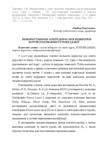 - Панченко, Л.Ф. (2017) Using of Future Learn open source courses in adult education Україна – ЄС: крос-культурні порівняння в освітніх дослідженнях. Матеріали І Міжнародної наукової конференції, 22-23 травня 2017 р., м. Київ. pp. 133-138.