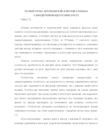 - Чайка, Г.В. (orcid.org/0000-0001-7799-1314) (2017) Personal autonomy as a key feature of personal self-determination In: Провідні тенденції та закономірності становлення базових парадигм української психології . ДП «Інформаційно-аналітичне агентство», м.Київ, Україна, pp. 41-42.