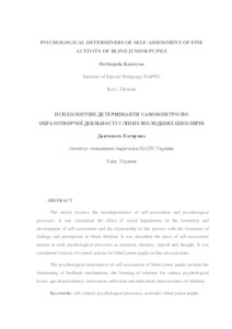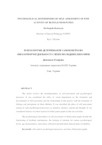 The article reviews the interdependence of self-assessment and psychological processes. It was considered the effect of visual impairment on the formation and development of self-assessment and the relationship of this process with the formation of feelings and perceptions in blind children. It was described the place of self-assessment actions in such psychological processes as attention, memory, speech and thought. It was considered features of control actions for blind junior pupils in fine arts activities. The psychological determiners of self-assessment of blind junior pupils include the functioning of feedback mechanisms, the forming of criterion for various psychological levels, age characteristics, motivation, reflection and individual characteristics of children.