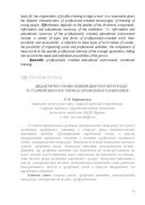 The article analyzes the problems of intersubject integration and its role in the organization of vocational education in upper secondary schools link. The foreign experience of specialized training, defined its advantages and disadvantages. Special attention is devoted to developments concerning Ukrainian didactics profiling Ukrainian school, intersubject integration. The question of the impact of the integration of scientific knowledge on the process of integration of educational material to high school. We give basic definitions of key concepts: profile school, integration studies, intersubject communication. It is noted that there is now need to define reserves efficiency of educational process on the basis of competence and integrated approaches and mechanisms for disclosing their use in professional work of teachers. The analysis of the theoretical developments in the field of intersubject integration and intersubject relations in teaching possible to determine the educational conditions for the implementation of integrative approach in profile school in unity invariant and variable components: establishing a system of intersubject concepts; adjustments artificial classification (differentiation) and fundamental social and human sciences; priority systems of modern technology, modern production bases. Proved that specialized education should be based on constructed on the basis of new learning content, new textbooks and teaching aids, changing the usual forms of educational process, integration of educational content, intersubject communication. Determined didactic conditions of realization integrative approach profile school in unity invariant and variable components.
