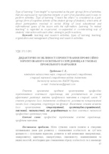 The article is devoted to the problem of designing professionally oriented educational environment, which is seen as a condition for effective implementation of profile education in high school. The article reveals its didactic features, the article considers the conceptual basis of its establishment, structure and functions. The article covered the main aspects of design: conceptual; organizational and management; substantial; technological, which are developed on the basis of education professional orientation of pupils. Methodological guidelines for the design of the educational environment in high school are a personal orientation, the principles of humanization and humanitarization, consideration of the content of education as one of the conditions for the formation of personality, the successful entry of it in society. The implementation of the objectives of the profile of learning will greatly contribute to the establishment of a school of professionally oriented educational environment. In the course of his design shall be taken into account methodological and didactic basis for the organization of profile training in high school, it is reasonable given the didactic characteristics of professional-oriented technologies of training of young people. Effectiveness depends on the quality of the structural components, information and educational resources of the institution. The information and educational resources of the professionally oriented educational environment include: a variety of types and forms of professionally-oriented work, their versatility and accessibility; a reflection in these types of work values of society; the possibility of organizing social and professional activities; the compliance of these works to the specific professional interests of the younger generation, taking into account the needs and individual possibilities of the person.