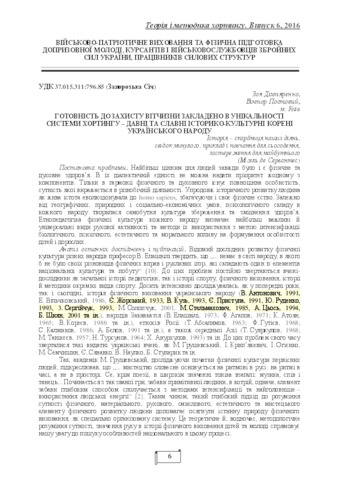 - Діхтяренко, З.М. (orcid.org/0000-0003-1869-7494) and Постовий, В.Г. (2016) The readiness to protect the Fatherland lies in the uniqueness of the Horting system – the ancient and glorious historical and cultural roots of the Ukrainian people Теорія і методика хортингу, 6. pp. 6-14. ISSN 2410-5317
