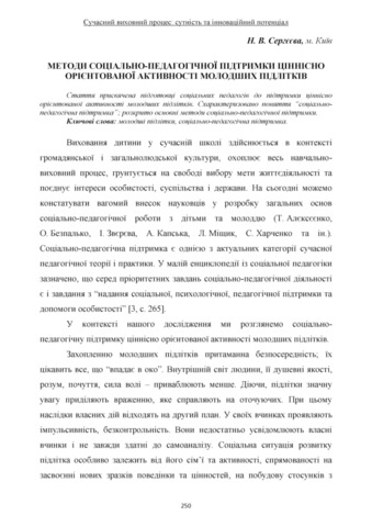 - Сергєєва, Н.В. (2017) Methods of social and pedagogical support of value-oriented activity of younger teens In: Сучасний виховний процес: сутність та інноваційний потенціал , 5 (5). НАІР, м. Івано-Франківськ, Україна, pp. 250-253.