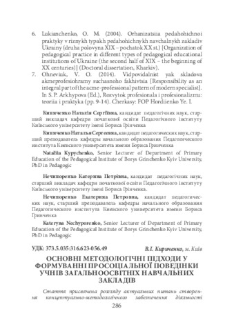 - Кириченко, В. І. (2017) Main methodological approaches to the formation of prosocial behavior of students in general educational institutions Теоретико-методичні проблеми виховання дітей та учнівської молоді, 1 (21). pp. 286-298. ISSN 2308-3778
