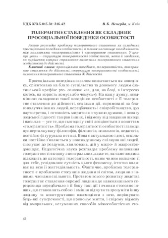 - Нечерда, В. Б. (2014) Tolerant Attitude as a Component of Pro-Social Behavior of Personality Теоретико-методичні проблеми виховання дітей та учнівської молоді, 2 (18). pp. 42-50. ISSN 2308-3778