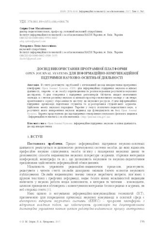 - Спірін, О.М. (orcid.org/0000-0002-9594-6602) and Лупаренко, Л. А. (2017) Experience of using «Open Journal Systems» software platform for information support of scientific and educational activity Інформаційні технології і засоби навчання, 5 (61). pp. 196-218. ISSN 2076-8184