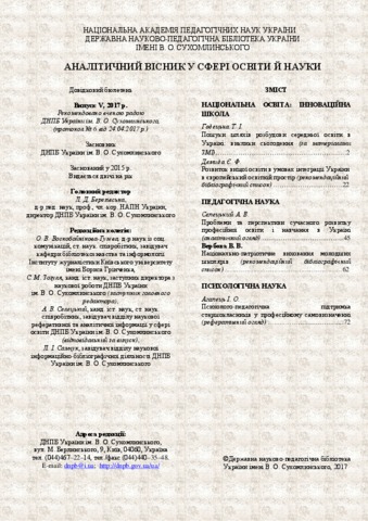 Bulletin is a component of information and analytical support education, pedagogy, psychology. Content categories "National education: innovative school", "Teaching Science", "Psychological Science" promotes Receiving user logically structured scientific information on issues of contemporary research on issues of national education, pedagogy, psychology, particularly in the form of abstract and analytical reviews, annotated bibliographic lists. The publication is designed for librarians and other information agencies, scientific and pedagogical staff, education candidates at various levels.
