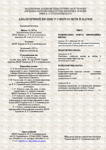 Самчук, Л. І., Мойсеюк, Ю. М., Селецький, А.В., Агалець, Інна Олександрівна and Горбенко, Н.А. (2017) Analytical Bulletin in education and science. Edition VI , 6 . Державна науково-педагогічна бібліотека України імені В. О. Сухомлинського, м. Київ, Україна.
