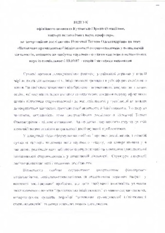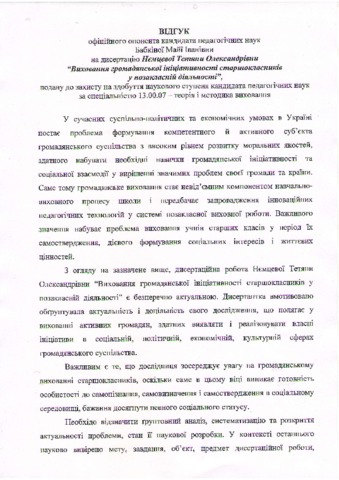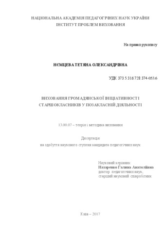 - Нємцева, Т.О. (2017) Education of Senior High School Students’ Civic Initiativity in Out-of-Class Activities Dissertation candidate thesis, Інститут проблем виховання.