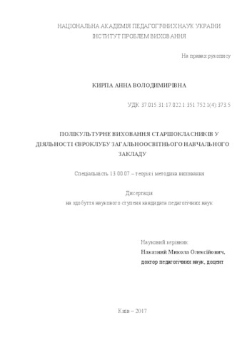 The thesis is devoted to the problem of multicultural education of senior students in Euroclubs of comprehensive secondary educational institution. Based on the analysis of national and foreign scientific, psychological and pedagogical literature, the research reveals the essence of multicultural education within Euroclub activity as the process of social and cultural identification of a person in a multicultural society, which is created and functions in the secondary educational establishment in order to recognize cultural diversity by senior students and develop a tolerant attitude towards cultural differences and ability to cooperate effectively with representatives of various cultural groups, ability to generate creative solutions to unusual situations while intercultural interacting (overcoming conflicts, working within a limited period of time or with a new team etc.).