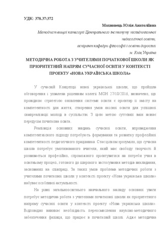 - Махновець, Юлія Анатоліївна (2017) Methodical work of primary school teachers as priority direction of modern education in the context of project «New Ukrainian school» In: Пріоритетні наукові напрямки педагогіки і психології: від теорії до практики: збірник тез міжнародної науково-практичної конференції: (13-14 жовтня 2017 р.) . Східноукраїнська організація «Центр педагогічних досліджень», м. Харків, Україна, pp. 32-34.