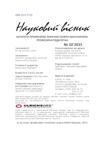 Anishchenko, Volodymyr, Бородієнко, О.В., Вовковінський, М.І., Закатнов, Д.О., Розіна, Надія Вікторівна, Гоменюк, Д.В., Kovalenko, Denys, Кулалаєва, Наталя Валеріївна, Алєксєєва, С.В., Смирнова, А.И., Герлянд, Т.М., Масліч, Світлана Володимирівна, Романов, Л.А., Ткачук, Г. Е., Пуховська, Л.П. and Movchan, Larysa (2015) Scientific Herald of the Institute of Vocational Education and Training of the National Academy of Pedagogical Sciences of Ukraine. Vocational pedagogy (10). ТОВ "НВП Поліграфсервіс", м. Київ, Україна. ISBN 2223-5752