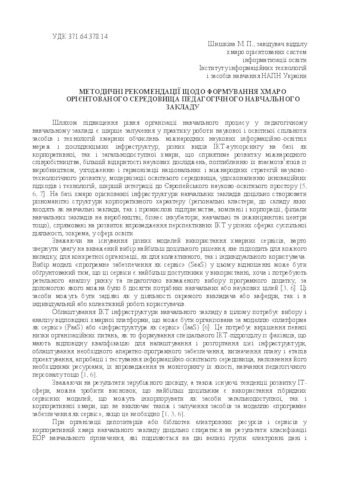 - Шишкіна, М.П. (2017) Methodical recommendations on the formation of a cloud-based environment of a pedagogical educational institution In: Reporting Scientific Conference of the Institute of Information Technologies and learning Tools of NAES of Ukraine . ІІТЗН НАПН України, м. Київ, Україна, pp. 198-201.