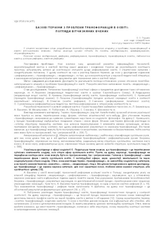 The article highlights the circumstances of development of conceptual and categorical determinations of the problems in educational transformations by Ukrainian scientists. The author analyzes modern approaches to the concepts of "modernization", "reformation", "transformation". Next to that considered and specified the content of such categories as "reform", "educational reform" and " school reform". Investigated that problems of determination in this direction were studied by following Ukrainian scientists: L. Berezivska, A. Boyko, A. Vasilyuk, V. Kremen, S. Krimsky, M. Mihalchenko, V. Ognevyuk, N. Pobirchenko A. Sbruyeva, S. Sysoiev, Y. Sokolovych Altunin, K. Shyhnenko and others. It notes that the terms "transformation", "reforming", "modernization" in the scientific pedagogical literature, are often used as synonyms rows. Despite the numerous interpretations, there is no unity in understanding of these concepts among scientists. Established that despite the wide using of the term "transformation" in the pedagogical literature, in fact the concept is not elaborated enough. In particular, the national pedagogical encyclopedic literature and vocabularies the term is absent. Analysis of the conceptual definitions about the problem in educational transformations by Ukrainian scientists in pedagogy helped us to identify the essential characteristics of the definitions which we research. The definition "transformation" includes the fundamental, structural, long-term, quality changes of the educational system with implementation of innovations. The essential characteristics of the deformational process are that it is mostly initiated and always carried by power authorities. Reformation – are changes occurring through reforms (reforms), which are characterized by a clear sense of purpose, without a radical transformation of the system. Determined that modernization – is part of a broader process (transformation or reformation), which characterized by updating, modernization, but not the entire system, but only some of its elements.