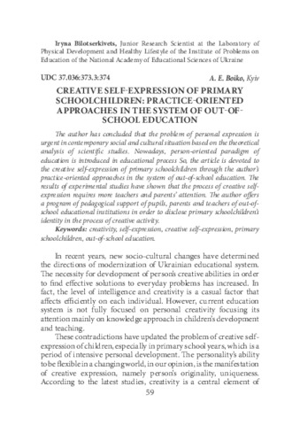 - Boiko, А. E. (2017) Creative self-expression of primary schoolchildren: practice-oriented approaches in the system of out-of-school education Теоретико-методичні проблеми виховання дітей та учнівської молоді, 21. pp. 59-68. ISSN 2308-3778