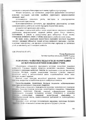 - Колонькова, Олена Олексіївна (2015) Preparing future teachers to creating the culture of schoolchildren’s environmental behavior In: Людиновимірність гармонізації культурно-освітнього простору майбутніх педагогів: наукові досягнення і перспективи : Матеріали міжнародної науково-практичної конференції (11-12 червня 2015 р.) , 1 . Видавництво МДПУ ім. Б. Хмельницького, м. Мелітополь, Україна, pp. 203-205. ISBN 978-617-7055-96-8