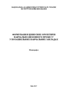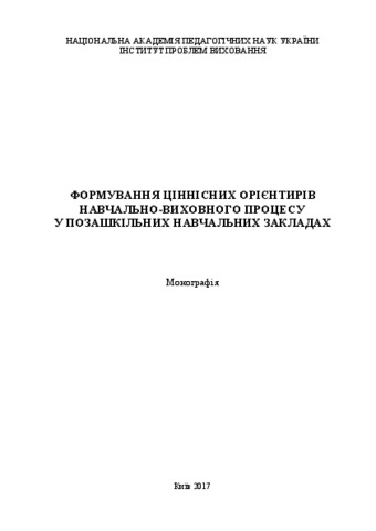 The monograph presents the results of the study of the formation of value orientations of the educational process in out-of-school educational institutions (OEI), conducted by the Laboratory of Out-of-School Education of the Institute of Problems on Education of NAES of Ukraine. The materials contain a thorough analysis of the leading theoretical positions on the implementation of the axiological approach in out-of-school education. The values that are formed in the cognitive and practical activity of pupils in OEI according to the basic directions of out-of-school education are determined. The publication highlights the significant aspects of the development of the out-of-school education of Ukraine in the context of contemporary educational tendencies, the theoretical basis of education of children and youth in out-of-school educational institutions on the basis of the axiological approach; the educational opportunities of these institutions are analyzed. The monograph is addressed to scientific and practical workers of the educational system, pedagogical workers of out-of-school educational institutions, post-graduate students, and students.