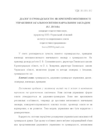 - Лісова, Н.І. (2010) The dialog with the community as criteria of effective management for secondary educational establishment Вісник Черкаського національного університету. pp. 164-168. ISSN 2076-586Х