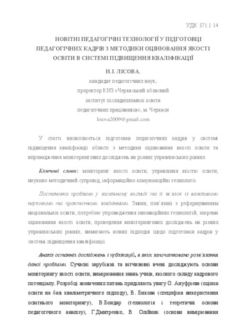- Лісова, Н.І. (2011) The latest pedagogical technologies in preparation of pedagogical staff from the methodology of estimation of quality of education in the system of improving qualification Якість технологій та освіти. pp. 115-121.