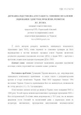 Abstract. In the article the author reveals the importance of Independent Testing, certain benefits and public perception of its implementation in the general secondary education in Ukraine; The results of the state final assesment (SFA) in a form of testing - achievements and challenges; presents new approaches in conducting the SFA and testing.