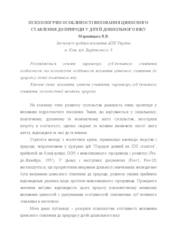 The main parameters of the subjective attitude of the personality and psychological peculiarities of the upbringing of value attitude towards nature in preschool children are considered.