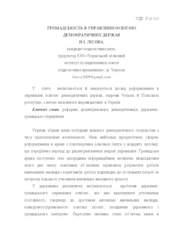 - Лісова, Н.І. (2010) Publicity in educational management of democratic states Вісник Черкаського університету. Серія «Педагогічні науки» (176). pp. 82-85. ISSN 2076-586Х