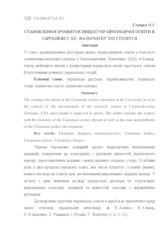 - Глушко, Оксана Зіновіївна (2009) Formation and development of higher Ukrainian studies abroad at the beginning of the XXI century Педагогічна освіта: теорія і практика, 1. pp. 45-50. ISSN 2307-4507