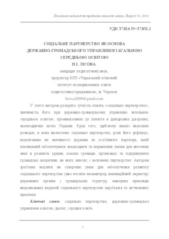 - Лісова, Н.І. (2016) Social partnership as the basis public-public administration of general secondary education Психолого-педагогічні проблеми сільської школи (54). pp. 183-191. ISSN 2307-4922