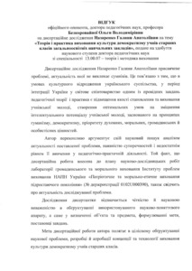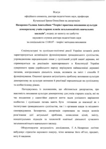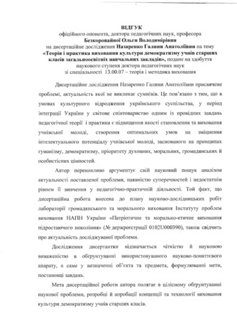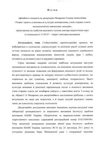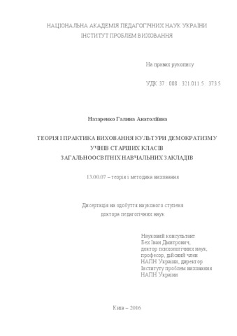 - Назаренко, Г.А. (2016) Theory and Practice of Educating Democracy Culture in Comprehensive School Senior Students Masters thesis, Інститут проблем виховання.