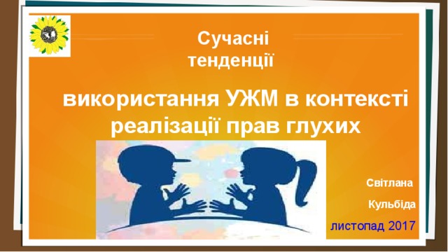 - Кульбіда, С.В. (orcid.org/0000 0002 0194 3495) (2017) Modern trends of using the USL in the context of the realization of the rights of the deaf In: науково-практична конференція за міжнародною участю на тему: “Формування публічної служби, чутливої до людини з особливими потребами: цифрові технології”, 10.11.2017, м. Київ, Україна. (Unpublished)
