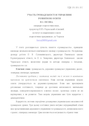 - Лісова, Н.І. (2010) The participation of community in the management of educational development Вісник Національного технічного університету «ХПІ» серія: «Нові рішення в сучасних технологіях», 46. pp. 114-119. ISSN 2079-5459