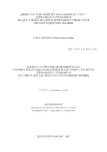The research examines governmental authorities’ activities on professional and career development of public servants in countries all over the world and Ukraine. The general system organization of these activities, its components and structure, directions of the organization improvement are determined. The key role and characteristics of professional training, typical gaps of public servants assessment and approach to appropriate Education and Health spheres achievements implementation have been specified. Components and structure of Public Service personnel competency are indicated, classification of cadre reserves and professional motivation of cadre have been defined. Scientific and expert assessment of national public servants professional development state is conducted. Scientific based concept of modernization of governmental authorities’ activities on professional development and prospect promotion of public servants in Ukraine have been suggested.