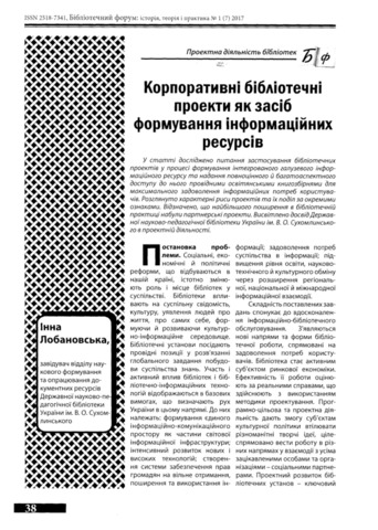 - Лобановська, Інна Георгіївна (orcid.org/0000-0002-7379-197X) (2017) Corporate Library Projects as a Means to Create Information Resources Бібліотечний форум: історія, теорія і практика, 1 (7). pp. 38-41. ISSN 2518-7341