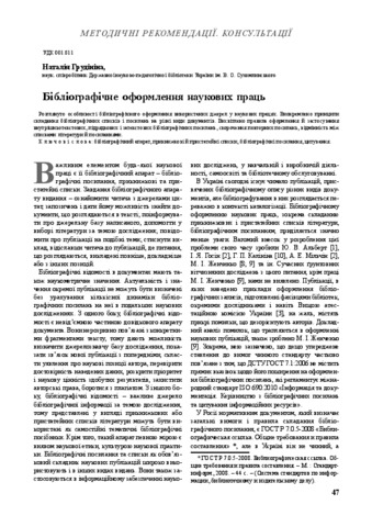 - Грудініна, Наталія Дмитрівна (2016) Bibliographic design of scientific works Бібліотечний вісник, 3 (233). pp. 47-50. ISSN 1029-7200