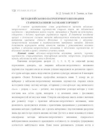 - Зубалій, М.Д. and Тимчик, М.В. (2017) Methods of military-patriotic education of senior pupils-hortingsmen Теоретико-методичні проблеми виховання дітей та учнівської молоді, 1 (21). pp. 238-249. ISSN 2308-3778