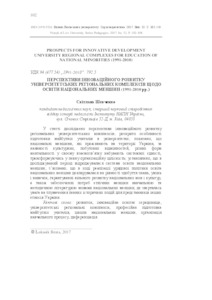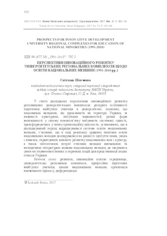 - Шевченко, Світлана Миколаївна (2017) Prospects for innovative development of university regional complexes for the education of national minorities (1991-2010) Bulletin of the University of Lviv (32). pp. 102-108. ISSN 2078-5526